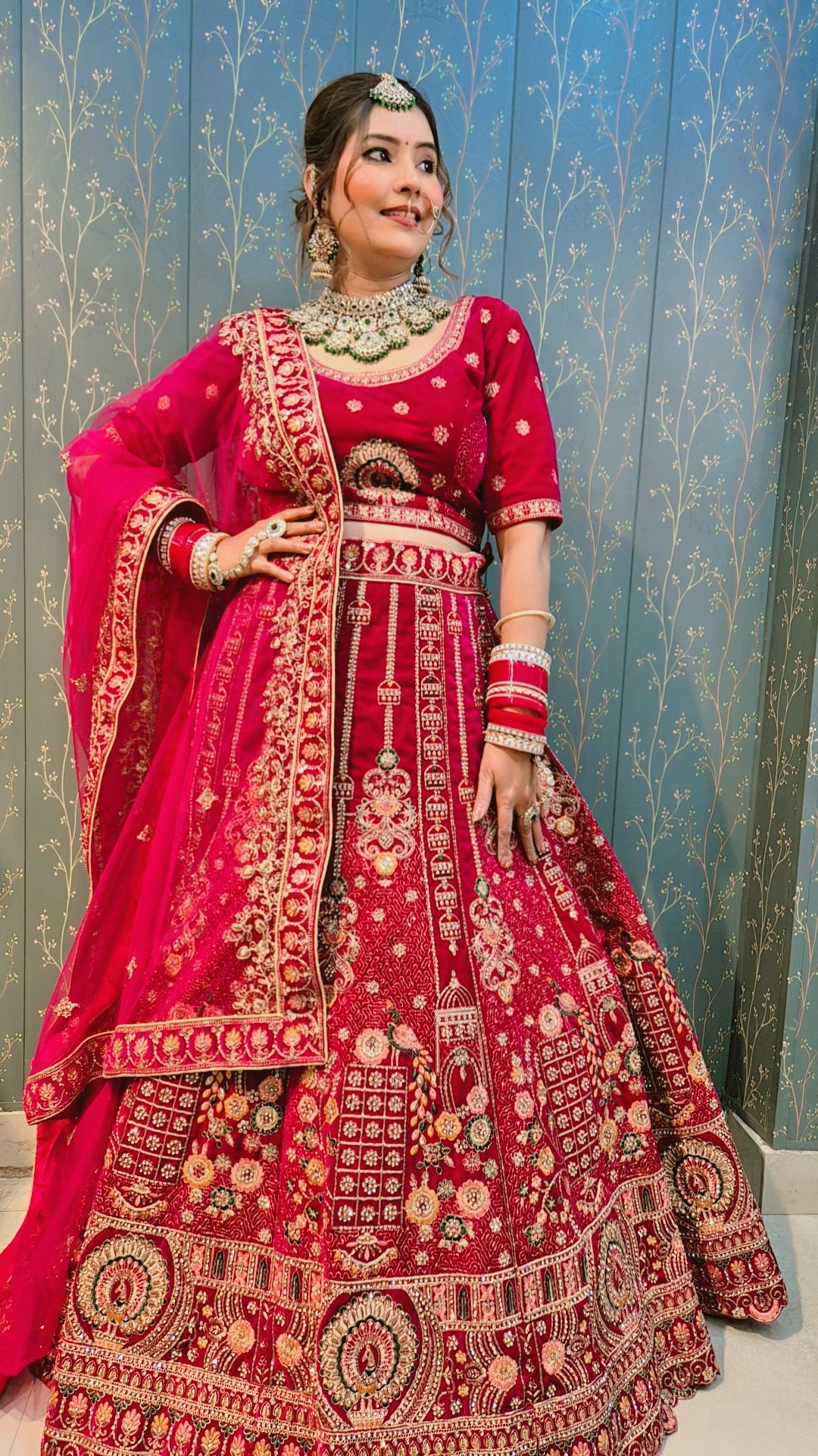 Exquisite red lehenga adorned with rich, intricate embroidery — crafted to make your special day truly unforgettable.
