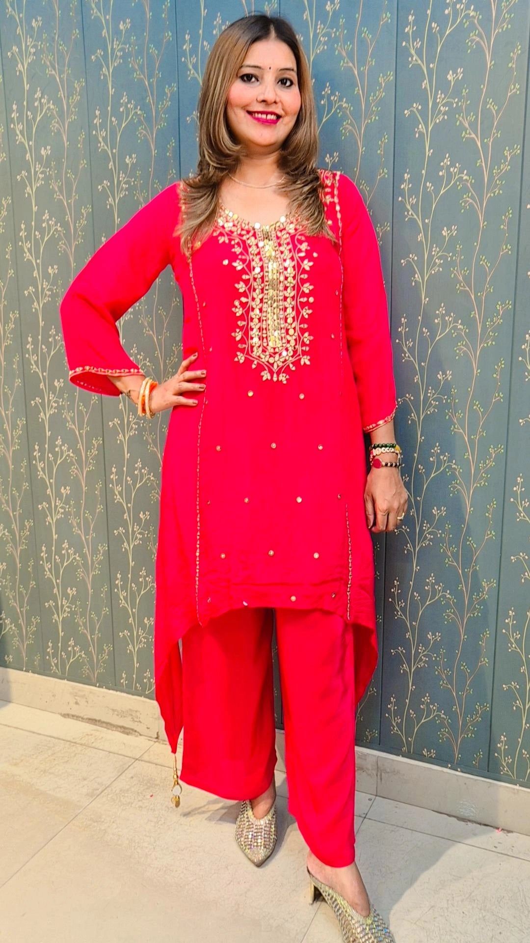 Go to the shopA chic crimson kurta set with golden thread embroidery and mirror accents — a perfect blend of elegance and festive flair.