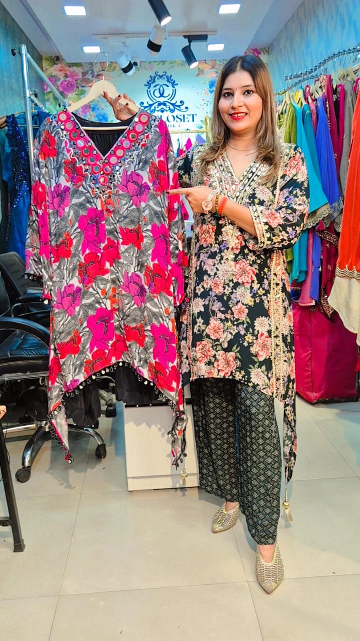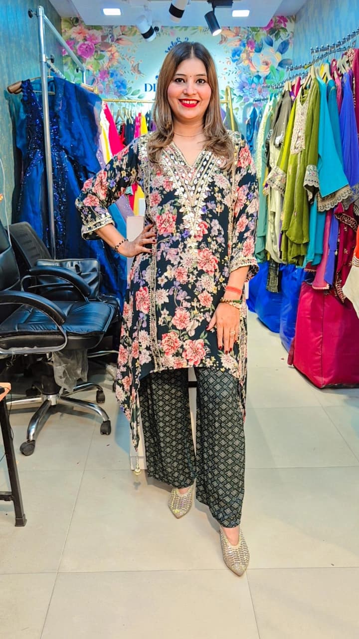 Our "Zyra" C Cut CoordSet With Plazzo In Beautiful Print Fabric Pure Crepe